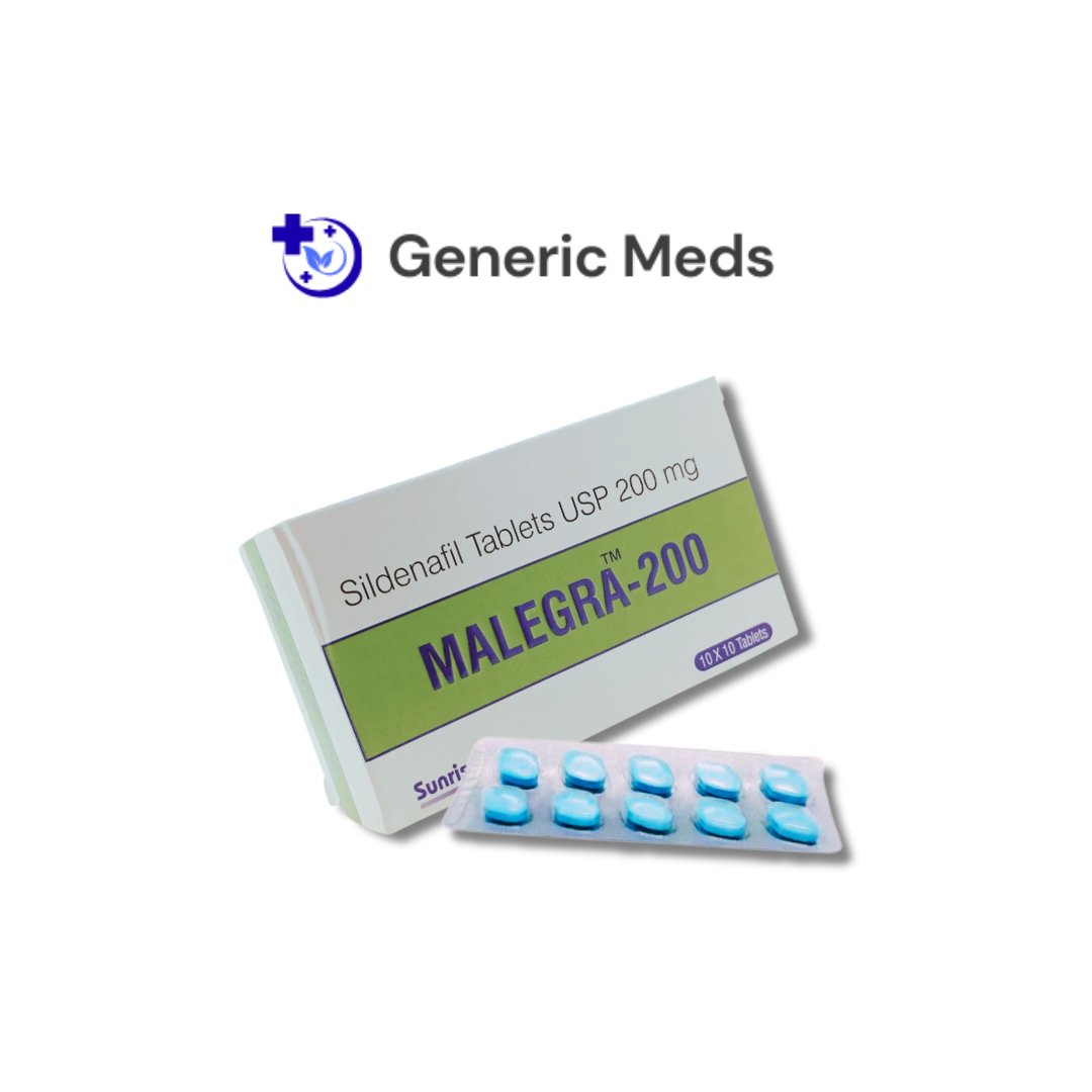 Malegra 200 mg is a prescription medicine used in the treatment of erectile dysfunction (ED) in adult men. It contains Sildenafil Citrate, a well-known PDE5 inhibitor that helps increase blood flow to the penis, supporting a firm erection during sexual stimulation.